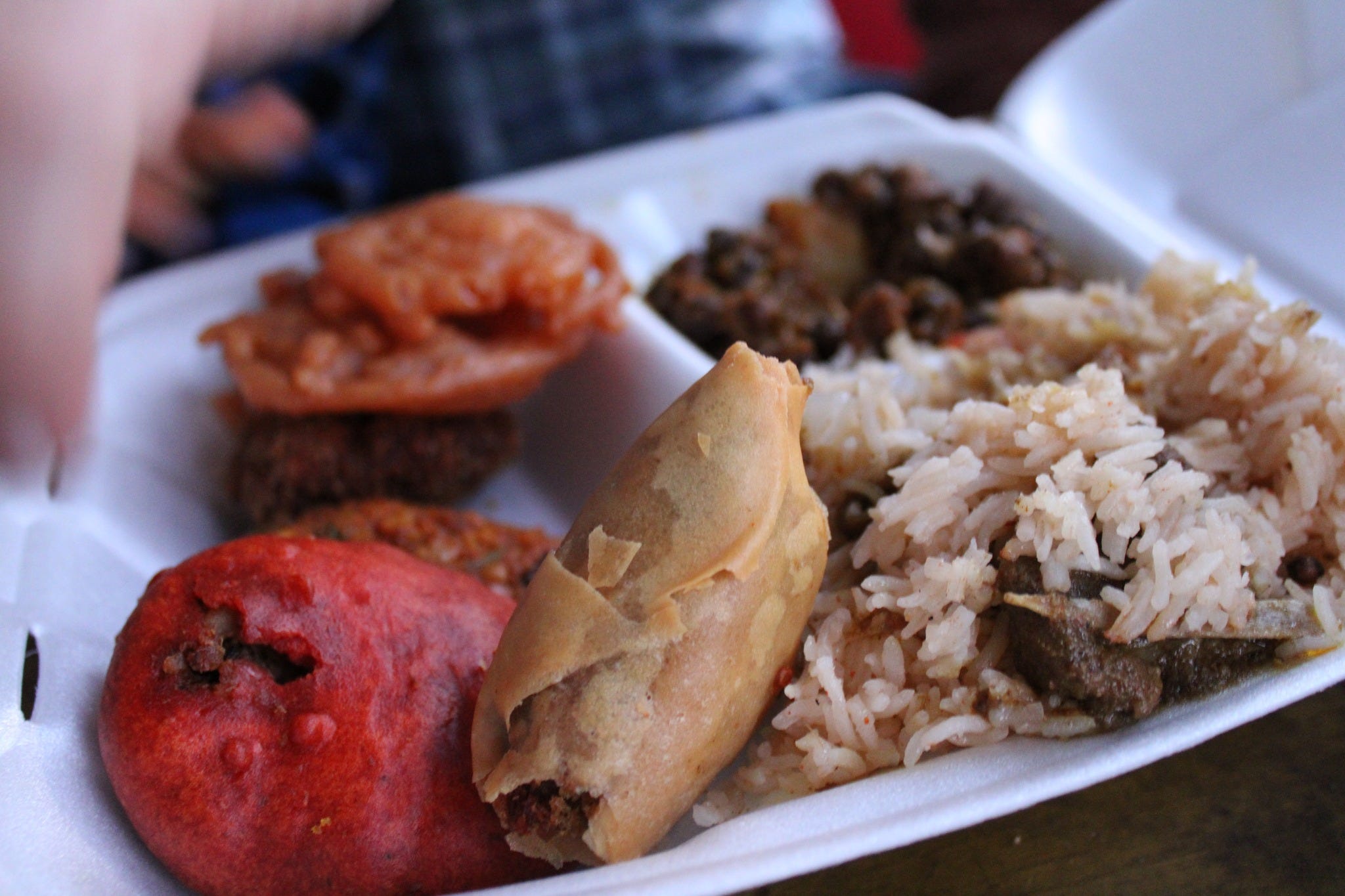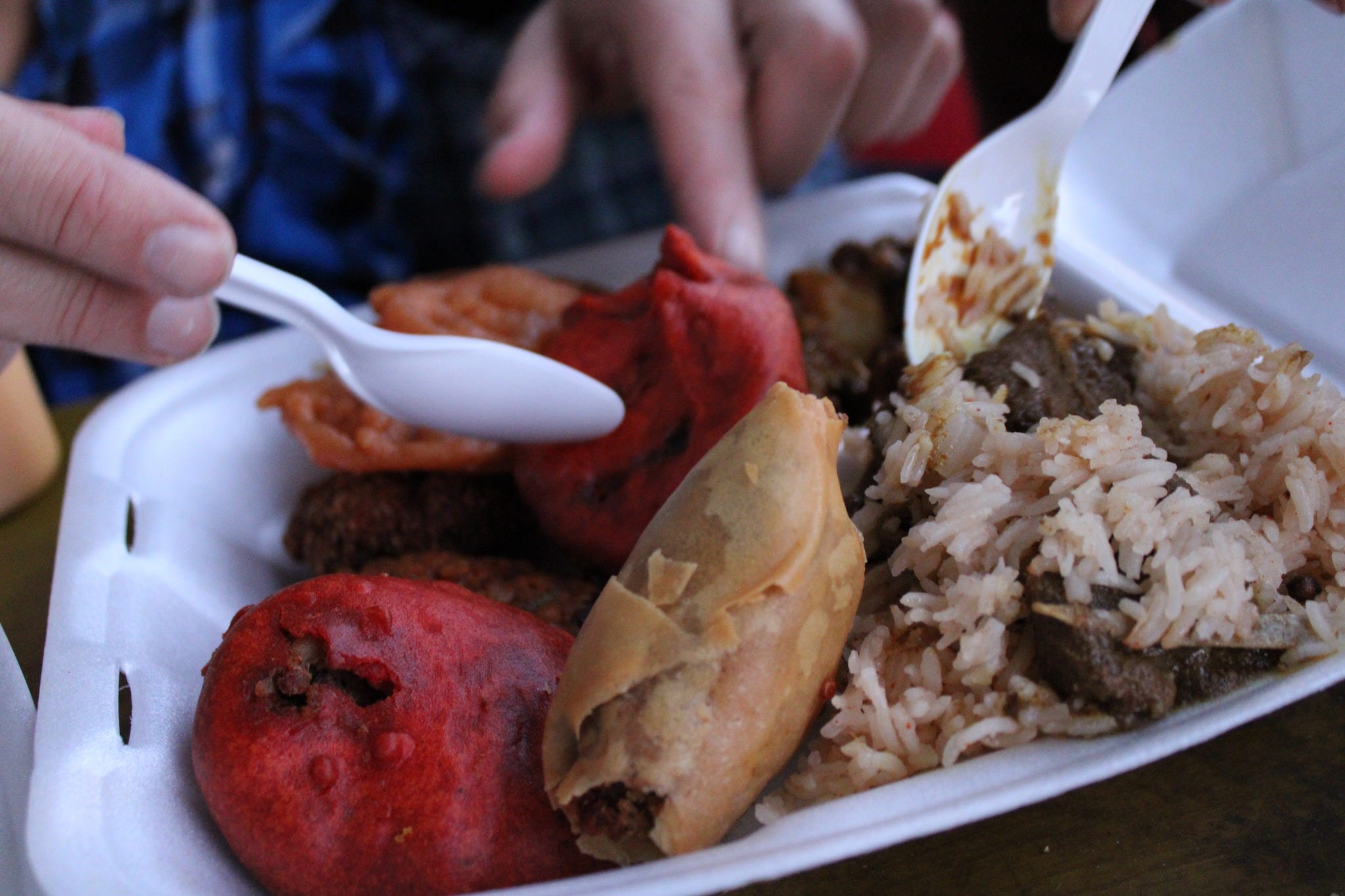 There we are - digging into the $10 iftar box which included pakoras, biryani, channa, a samosa, and some jalebis.