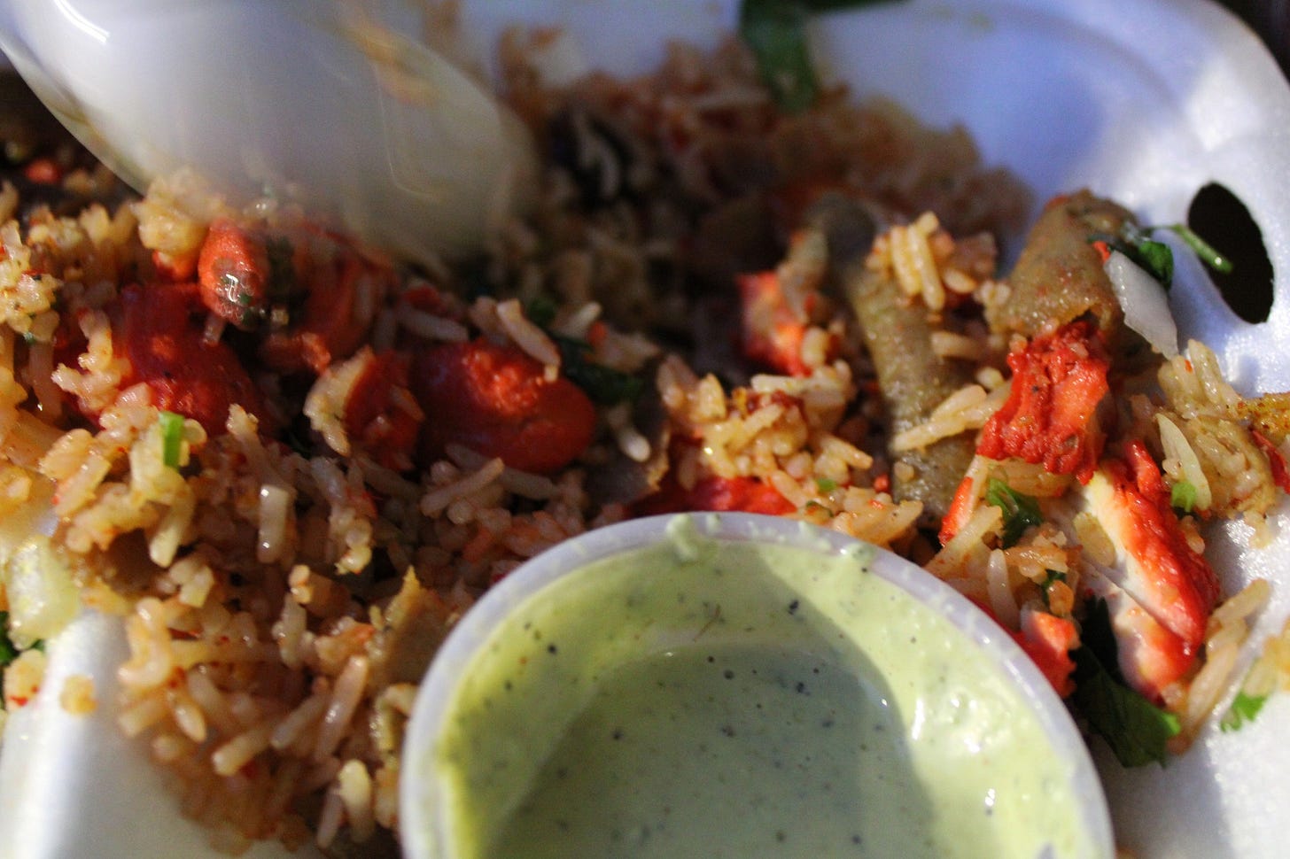 And that's the mixed biryani - with lamb and chicken shwarma - served with a side of sweet green chutney.